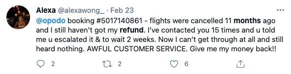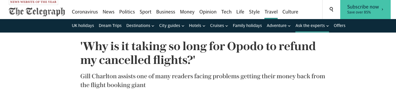 Opodo is an online travel agency. Opodo is regularly rated poorly by customers and in 2020, Opodo won an award for the worst customer service in the world. During Covid, many millions of passengers had flights cancelled and were left chasing refunds from Opodo and other online travel agents like BudgetAir, eDreams and Hays Travel.