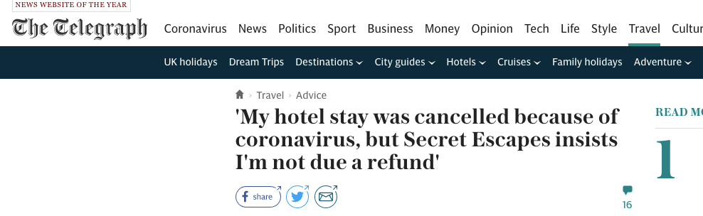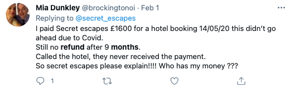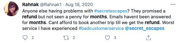 Secret Escapes is an online booking site for luxury hotels and home rentals. Secret Escapes is regularly poorly rated for their customer service and is rated 2.7 on Trustpilothttps://uk.trustpilot.com/review/www.secretescapes.com with 25% of reviewers leaving a rating of Poor. During Covid, many millions of customers had hotel bookings cancelled and were left chasing refunds from Secret Escapes and other online travel agents like BudgetAir, eDreams and Opodo.